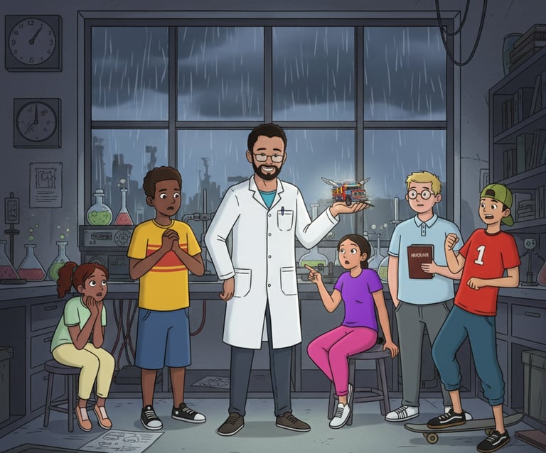 Este capítulo presenta a los personajes principales. Los chicos están buscando una forma de pasar el rato en un día lluvioso, hasta que deciden visitar al profesor Vidal. ¡Y ahi la aventura comienza!
